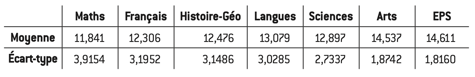 Les moyennes et les écarts-types par champ ne figurent sur aucun document réalisé par l’académie de Paris à destination des familles. Il est cependant possible pour un élève de demander au rectorat, après son affectation, sa « fiche-barème ». Sur cette fiche figure, pour chaque matière, la moyenne annuelle après le premier lissage ainsi que, pour chaque champ, la moyenne annuelle lissée (MAL). On peut donc, pour un champ donné, reconstituer à partir de deux fiches-barèmes (ayant des moyennes annuelles [MA] différentes pour ce champ) la moyenne annuelle académique et l’écart- type académique (cela revient en effet simplement à résoudre un système linéaire de deux équations à deux inconnues). Ainsi, pour l’année 2023 (ces moyennes et ces écarts-types varient très peu d’une année à l’autre), on obtient le tableau suivant60 :