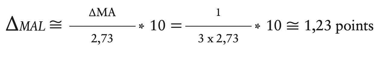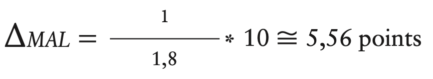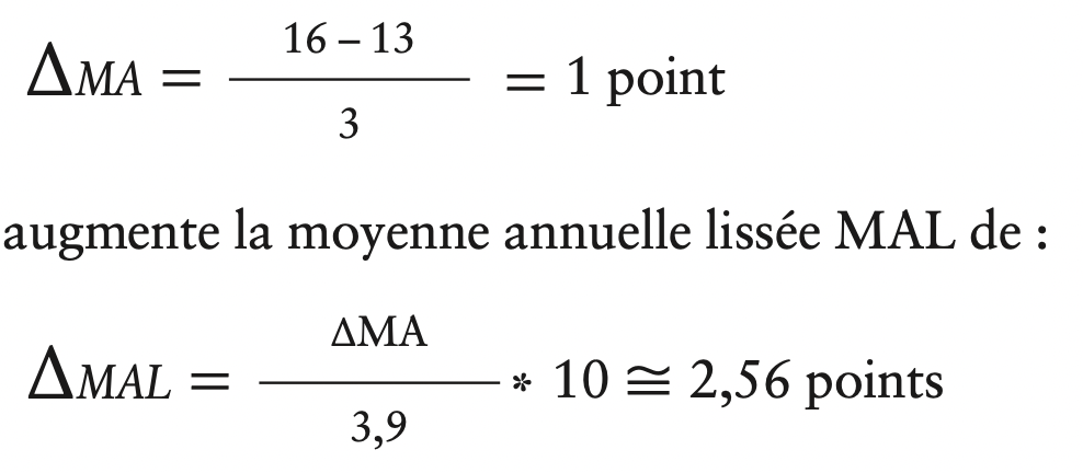 Le coefficient des mathématiques étant égal à 5, on peut finalement en conclure que le passage du seuil de 15 à un trimestre en mathématiques rapporte 5 × 2,56 ≅ 13 points. L’écart-type en EPS est beaucoup plus faible : environ 1,8. Par conséquent, le passage du seuil de 15 à un trimestre en EPS, qui augmente la moyenne annuelle de 1 point (par le même calcul que celui effectué pour les mathématiques) augmente la moyenne annuelle lissée MAL de :