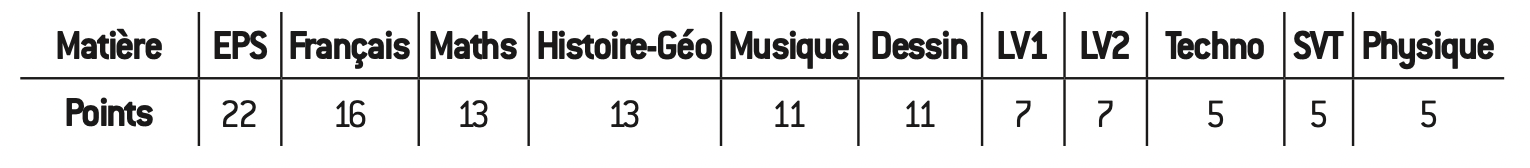 Un calcul similaire peut être réalisé pour tous les champs disciplinaires. On obtient alors que la quantité maximale de points associée au bulletin scolaire n’est pas de 4.800 mais de 3.301 points.