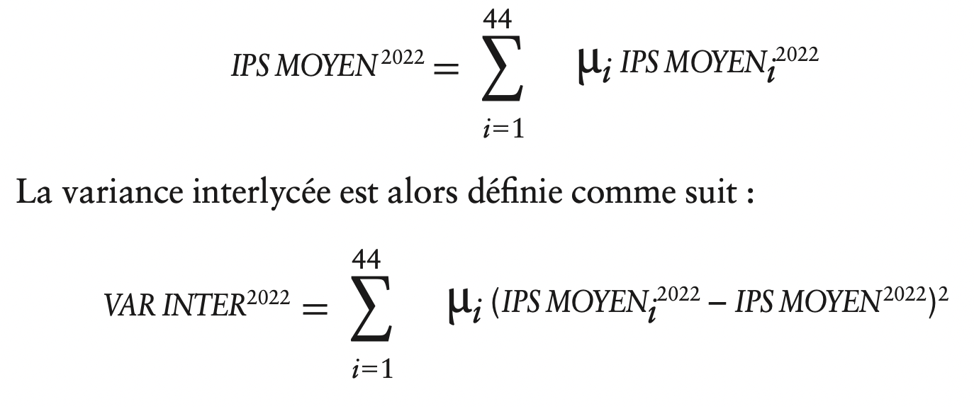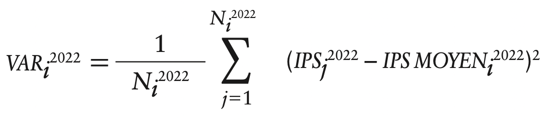 Pour définir la variance intralycée, il faut dans un premier temps calculer, pour chaque lycée i, la variance VARi2022 associée au lycée i, c’est-à-dire la variance de l’indice IPSj2022 des élèves j appartenant au lycée i :