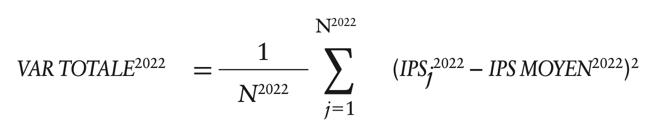Enfin, la variance totale est la variance de l’indice IPS dans la population totale des élèves de seconde scolarisés dans un lycée public parisien. Autrement dit, si on note IPSj2022 l’IPS de chaque élève j :