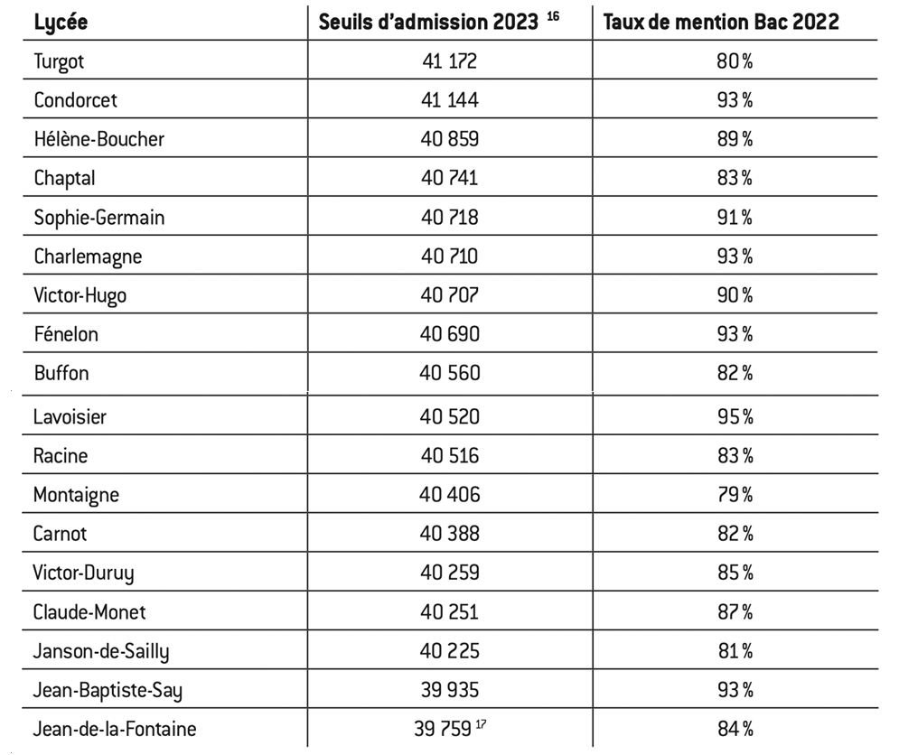 Seuils d’admission 2023 des 18 « lycées de niveau » parisiens