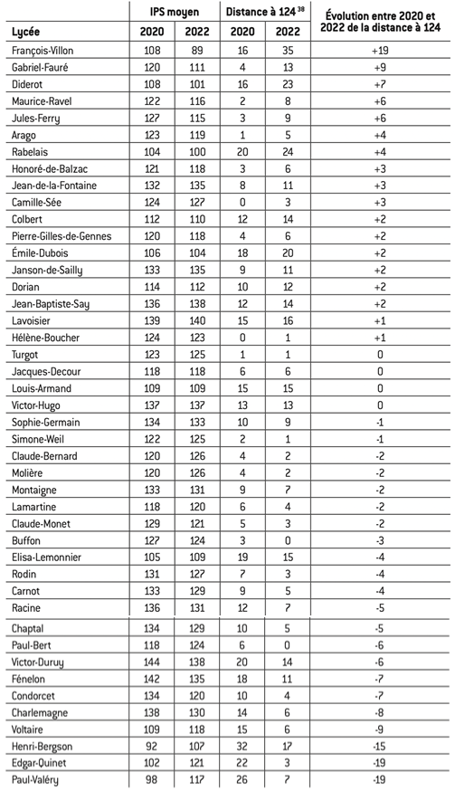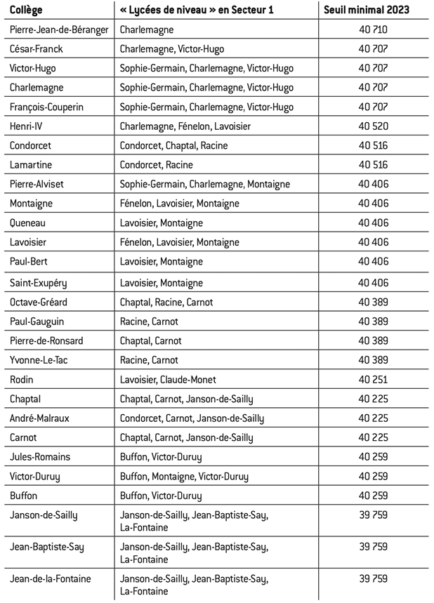 – 3 « lycées de niveau » (Fénelon, Condorcet, Charlemagne) qui sont devenus, comme nous l’avons souligné, inaccessibles ou très difficiles d’accès pour les élèves de collèges sans bonus IPS ;
