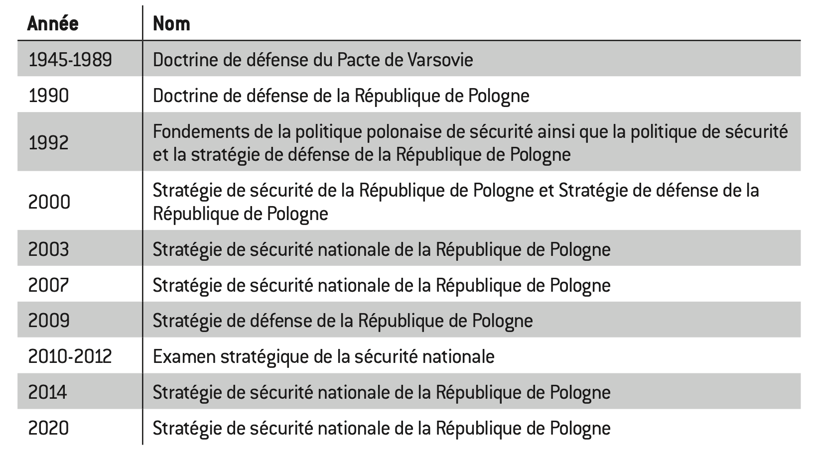 Le général Stanisław Koziej propose de diviser les stratégies entre celles qui furent mises en place juste après 1989, dans les conditions où la Pologne retrouvait son « indépendance stratégique » et négociait son adhésion à l’OTAN, et celles qui vinrent ensuite lorsque la Pologne était déjà membre de l’Alliance après 199912.