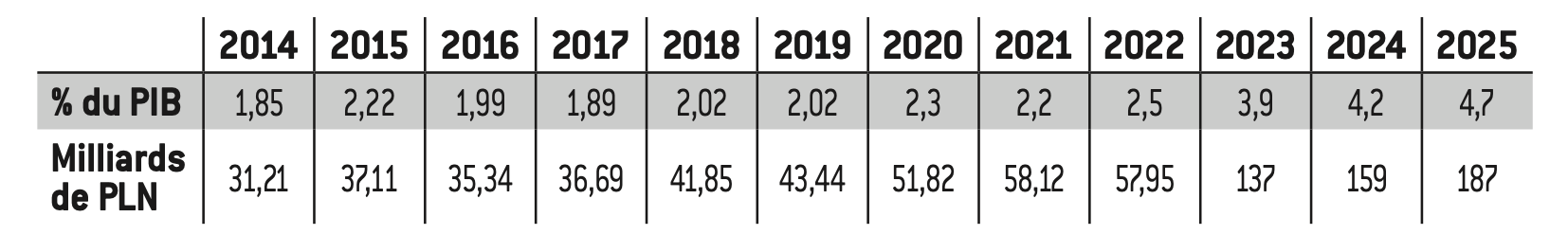 “Military expenditure by country, in millions of US$ at current prices and exchange rates, 1949-2023, Military expenditure by country as percentage of gross domestic product, 1949-2023”, SIPRI Military Expenditure Database, 2023 [en ligne] ; Ustawa budżetowa na 2021 rok, 20 janvier 2021 [en ligne] ; „Odpowiedzialny, ale hojny – budżet na 2025 rok przyjęty”, Chancellerie du président du Conseil des ministres, 28 août 2024 [en ligne] ; Decyzja budżetowa na rok 2025 nr 10/Minister obrony narodowej z dnia 23 stycznia 2025 r., Dziennik urzędowy Ministra obrony narodowej, 24 janvier 2025 [en ligne].