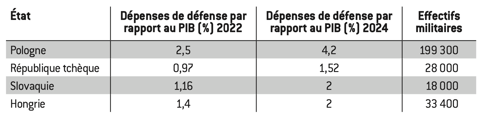 Tableau 3 : Dépenses de défense de la Pologne comparées à celles des pays du groupe de Visegrád (2022-2024)