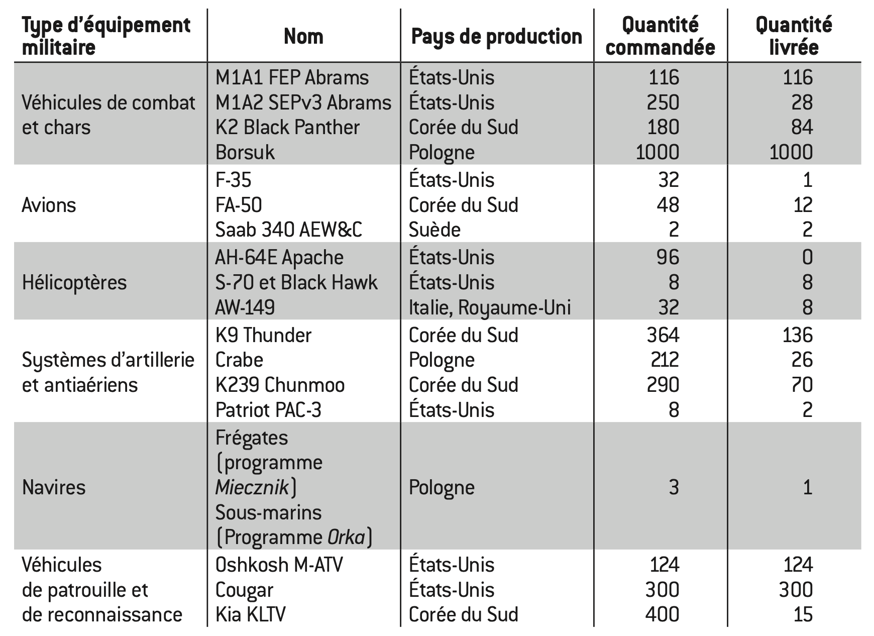 L’augmentation des dépenses s’accompagne d’un plan d’acquisition de matériel militaire, principalement auprès des États‑Unis et de la Corée du Sud. En outre, la Pologne a obtenu un prêt de 4 milliards de dollars des États‑Unis pour d’autres achats de matériel militaire, notamment des systèmes de défense aérienne Patriot et des hélicoptères Apache. Les forces armées polonaises ont en effet été sous-investies pendant des décennies, avec des équipements obsolètes datant de l’époque du Pacte de Varsovie. Jusqu’à l’adhésion à l’OTAN en 1999, les achats ont été peu nombreux et les possibilités de modernisation de l’armée polonaise limitées. La situation a radicalement changé en février 2022, lorsqu’une part importante de l’armement polonais a été envoyée sur le front ukrainien, ce qui a incité le ministère de la Défense (MoD) à signer de nouveaux contrats23. Les commandes passées, dont certaines ont été honorées en 2025, concernent différents types d’équipements militaires. Parmi ceux-ci, les plus importants sont24 :
