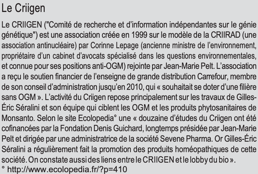 Gilles-Éric Séralini étant professeur des universités à Caen, sa publication discutée icimentionne bien « University of Caen, Institute of Biology », mais elle indique aussi son affiliation au Criigen (voir encadré). À la fin de l’article (p. 4230) est également fait mention du financement de l’étude par l’Association Ceres (créée par Gérard Mulliez, ancien patron d’Auchan), la Fondation Charles Léopold Mayer pour le progrès de l’homme (une organisation familale de droit suisse31 qui finance, entre autres, des associations écologistes et altermondialistes32), le ministère français de la Recherche et du Criigen. Auchan a confirmé avoir contribué au financement de l’étude. Carrefour a reconnu des financements jusqu’en 2010 (donc au début de l’étude). Pour autant, la publication de Séralini ne déclare pas de conflits d’intérêts. Dans son livre Tous cobayes !, sorti à la même époque que son article, Gilles-Éric Séralini explique que, pour ne pas « apparaître aux yeux de nos détracteurs comme des scientifiques financés directement par le lobby de la grande distribution […], le Criigen, alors sous la présidence efficace de Corinne Lepage, a joué un rôle capital dans le montage de l’expérience car il a assuré l’interface avec les associations donatrices (Ceres, puis […] la fondation Charles Léopold Mayer pour le progrès de l’homme avec son directeur Matthieu Calame, spécialiste de l’agriculture de proximité et durable, et quelques autres…)33». Le sénateur et ancien député UMP François Grosdidier, opposant de longue date aux OGM (notamment sous l’influence de Jean-Marie Pelt), a également révélé avoir contribué au financement de l’étude sur sa réserve parlementaire, à hauteur de 100.000 euros34. Par ailleurs, le site Agriculture et Environnement a mis en lumière des détails sur les liens entre Séralini et l’entreprise Sevene Pharma, société elle-même en lien avec un conglomérat comprenant l’association ésotérique Invitation à la vie (IVI)35.