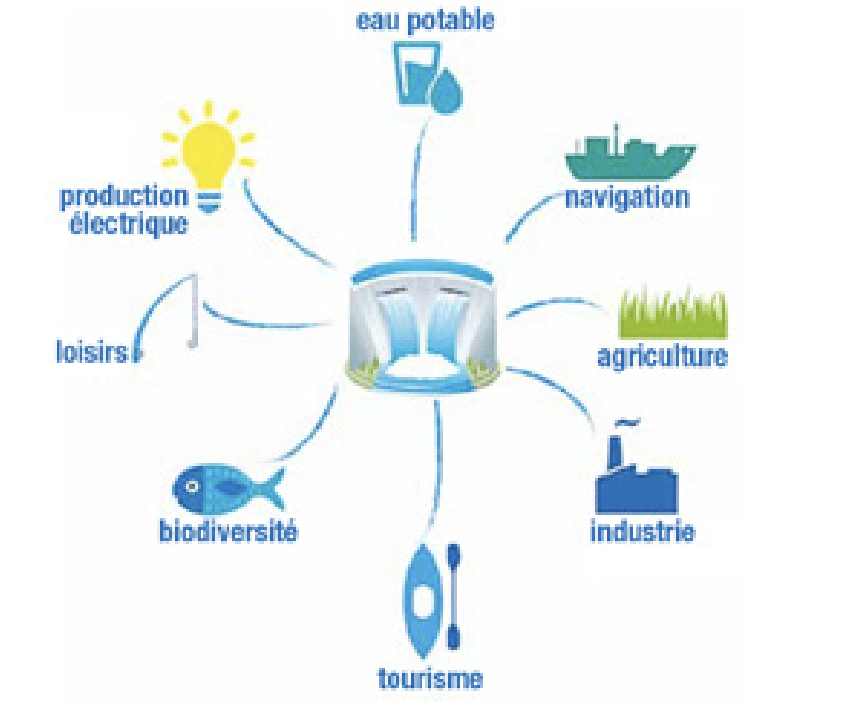 La gestion de l’eau se trouve confrontée à de multiples contraintes et, selon une formule heureuse de Claude Thirriot, doit être étudiée selon trois points de vue, « l’hydraulique de l’effort, l’hydraulique du transport et l’hydraulique du confort10 ». L’exploitation de l’énergie hydraulique s’insère dans une approche systémique qui intègre, par exemple, l’usage agricole et récréatif des réserves d’eau, la pisciculture et la navigation, autant d’usages concurrents et complémentaires qui imposent une gestion de bassin cohérente au service de l’aménagement du territoire. Ces usages, qui peuvent se révéler conflictuels, exigent une concertation territoriale efficace.