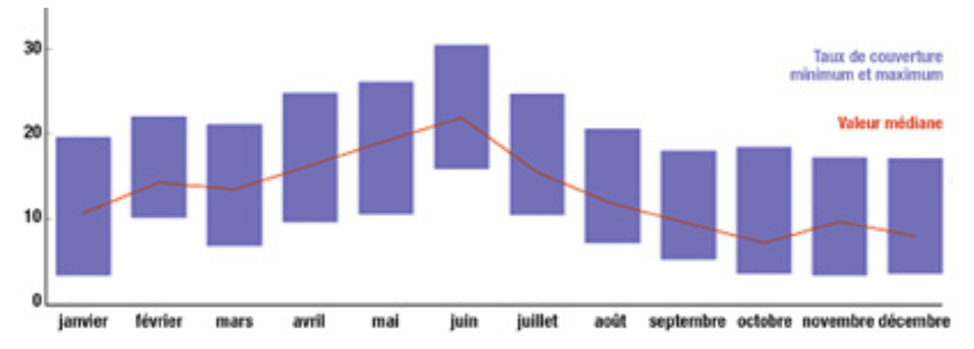 Taux de couverture mensuel de la consommation électrique française par la production hydraulique (en %)