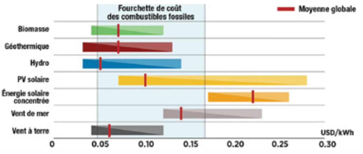 Coûts moyens de production d’énergie renouvelable dans la gamme des combustibles fossiles en 2017