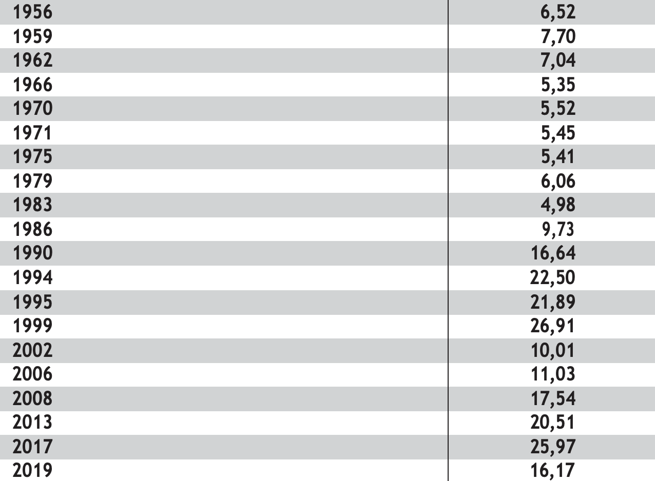 Les résultats électoraux du FPÖ au Conseil national (1956-2019, en %)