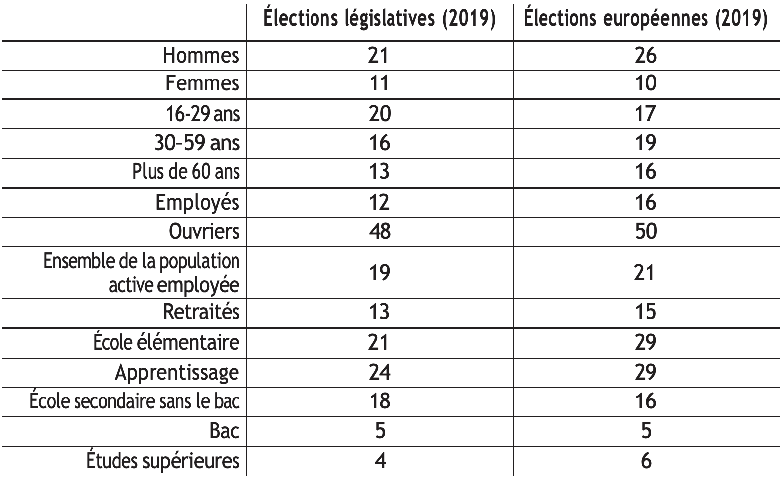 Le FPÖ continue de dominer parmi l’électorat ouvrier (50%). Les retraités sont tendanciellement réfractaires au choix FPÖ (21%) et préfèrent l’ÖVP (39%)89.