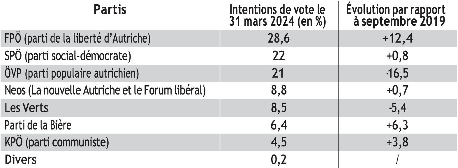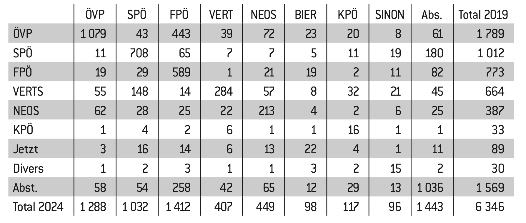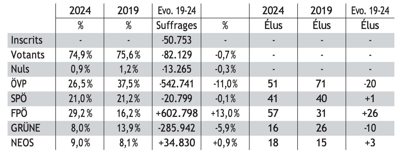 Sur les 1.412.000 personnes qui ont voté en 2024 pour le FPÖ, 589.000 seulement avaient voté pour le FPÖ en 2019. Le FPÖ perd 82.000 voix au profit des abstentionnistes, du SPÖ (29.000), de NEOS (21 000) et de l’ÖVP (19.000). Ces pertes sont toutefois largement compensées par les voix gagnées sur l’ÖVP (443.000) ; 258.000 abstentionnistes de 2019 ont rejoint le FPÖ. 65.000 électeurs SPÖ de 2019, 25.000 électeurs des NEOS et 14.000 des Verts se sont aussi ralliés aux Freiheitlichen.