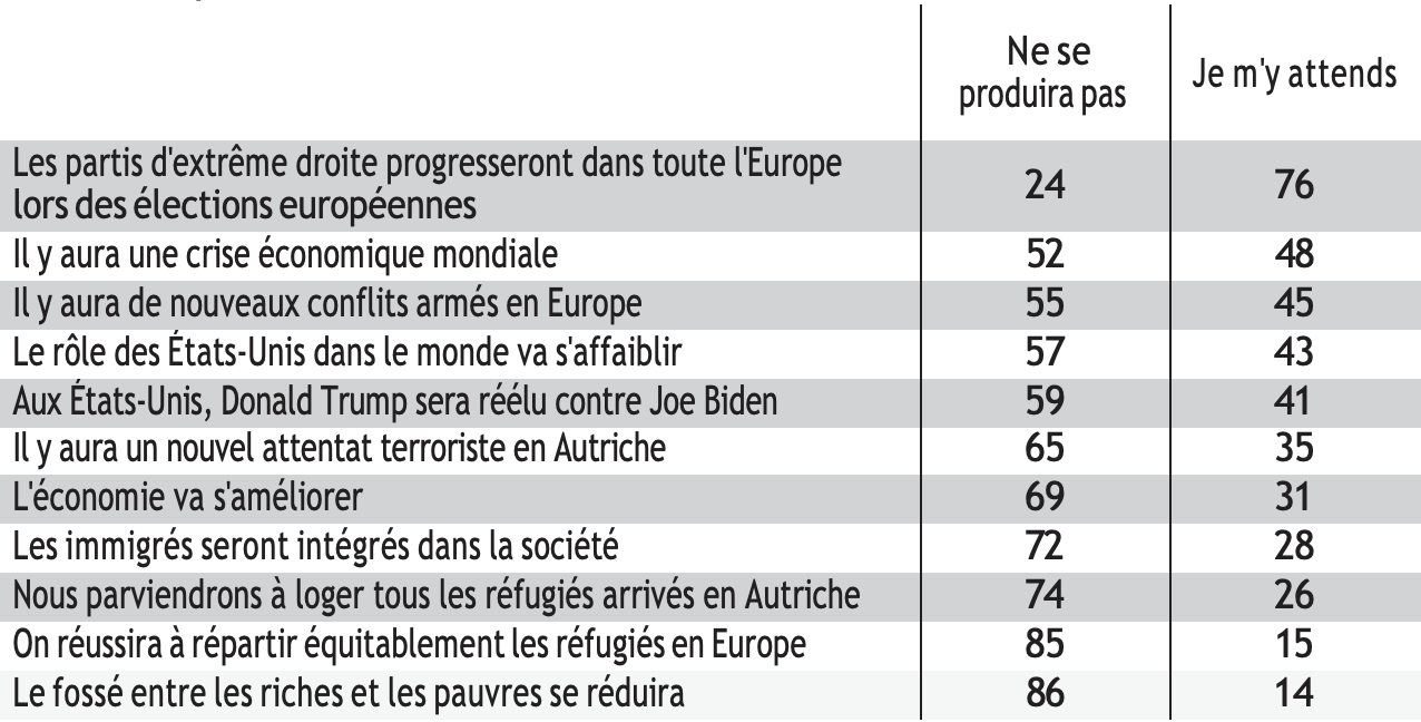 Le pessimisme économique est répandu dans la population : une personne sur deux s’attend à ce qu’une crise économique mondiale survienne en 2024 et 31% seulement des personnes interrogées s’attendent à ce que l’Autriche connaisse une reprise économique. Ce thème est constamment exploité par le FPÖ. La crainte d’une restriction des droits démocratiques est croissante depuis plusieurs années, les proches du FPÖ craignant l’action de « puissances cachées » (Deep State)27 et la mise en place d’une « surveillance étatique »28.