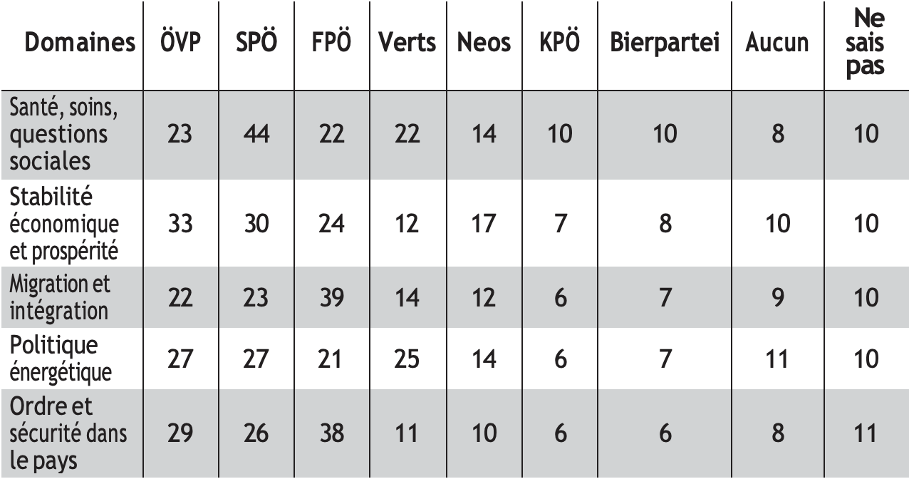 L’enquête de l’institut Gallup, à la fin du mois de janvier 2024, interrogeait les Autrichiens sur le fait de savoir quels partis avaient leur confiance pour relever les défis actuels65. Le SPÖ arrivait en tête pour les questions sociales et de santé (44% lui font confiance sur ce thème) suivi de l’ÖVP (23%), du FPÖ (22%) et des Verts (22%) tandis que le FPÖ domine lorsqu’il s’agit de l’immigration (39%). L’ÖVP, qui articule également sa campagne autour de ce thème, n’obtient que 22% et fait moins bien encore que le SPÖ (23%). L’ÖVP est en tête en matière de politique économique, mais de justesse (33%), à peine plus que le SPÖ (30%) et que le FPÖ (24%). Sur le thème de la politique énergétique, l’ÖVP, le SPÖ et les Verts sont presque à égalité (de 25 à 27%), tandis que le FPÖ est à nouveau en tête sur la sécurité intérieure (38%, ÖVP 29%, SPÖ 26%, Verts 11%).
