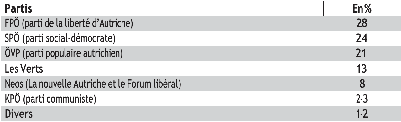 À l’occasion des élections au Conseil national, le FPÖ est devenu la première force politique. Il a obtenu 28,9% des voix, ce qui représente une augmentation de 11 pts, chiffres provisoires, par rapport aux élections précédentes, en 2019. Le FPÖ disposera de 57 députés au Parlement. Ce résultat est une déception pour le parti qui n’atteint pas la minorité de blocage (62 sièges). La droite de l’ÖVP recule de 11 pts, avec 26,5% des suffrages, tandis que la gauche sociale-démocrate, le SPÖ, fait le plus mauvais score de son histoire avec 21% de voix. Le parti libéral NEOS est à 9%, les Verts à 8%. Une surprise de l’élection a été l’échec des petits partis. Le Bierpartei est à 2%, le Parti communiste autrichien à 2,3%. La coalition en place ÖVP-Verts a été punie par les électeurs, les deux partis ne rassemblant plus que 38% des voix.
