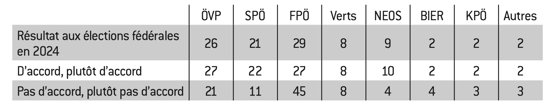 Les sondages montrent qu’une possible coalition ÖVP/SPÖ/NEOS est favorablement accueillie par une forte minorité parmi les personnes interrogées (ÖVP 32% ; SPÖ 33%, NEOS : 67%), alors qu’une alliance ÖVP-FPÖ est clairement rejetée par les électeurs ÖVP (ÖVP 21%, FPÖ : 74%)95.