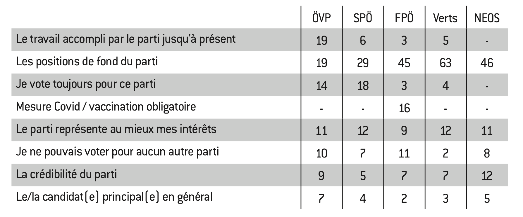 Les motifs de vote pour les principaux partis. Tableau simplifié (en %)