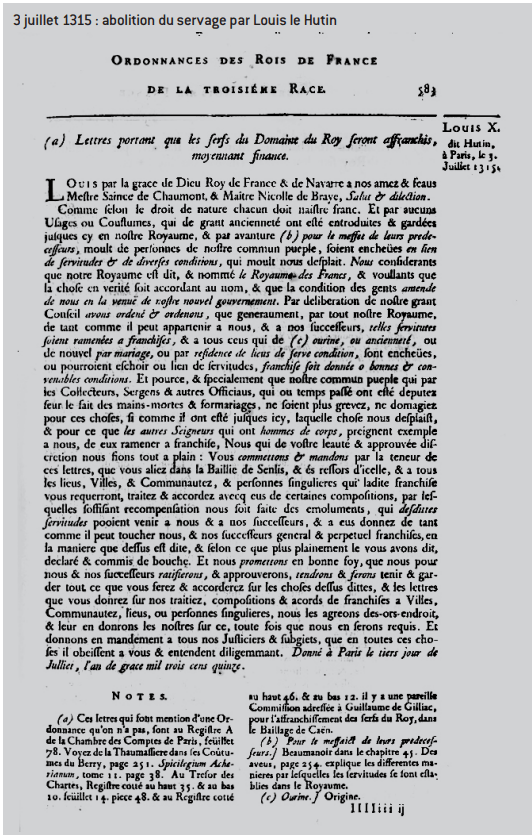 Source : « Ordonnance royale du 3 juillet 1315 » dans Eusèbe Jacques de Laurière, Ordonnances des rois de France de la troisième race, Volume 1, 1723, p.587 [en ligne].