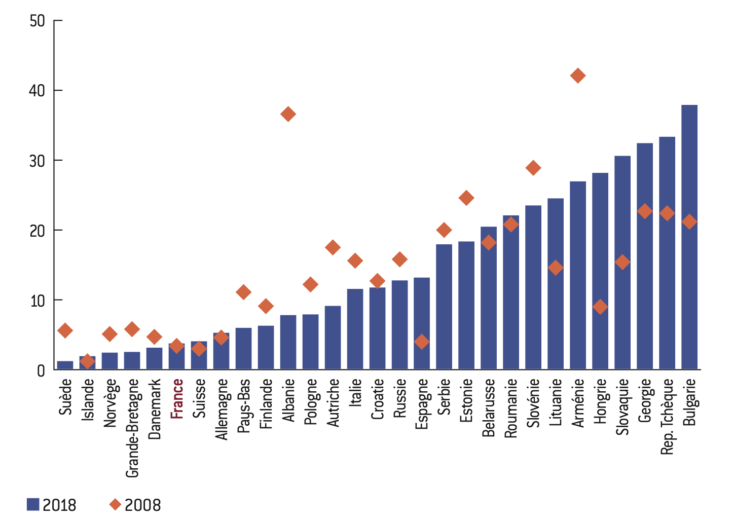 Un indicateur encore plus significatif est de savoir avec qui on refuserait de voisiner ? D’après les enquêtes sur les valeurs des Européens (graphique 2), peu de Français disent qu’ils ne veulent pas avoir pour voisins des immigrés (13% en 1990, 9% en 2018) ou des gens d’une autre race (9% en 1990, 4% en 2018). Ces chiffres sont parmi les plus faibles d’Europe. Ils sont sans commune mesure avec les groupes qui suscitent nettement plus d’hostilité comme les drogués (57% des Français n’en veulent pas comme voisins), les alcooliques (41%) ou les Gitans (23%13).