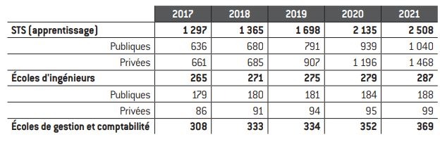 Les sites à destination des jeunes et de leurs familles reflètent le dynamisme du secteur privé. Une recherche sur l’item du privé fait ressortir plus de 4000 établissements, dont beaucoup de Centres de formation d’apprentis (CFA) sur Studyrama comme sur L’Étudiant. Après filtrage des doublons et des établissements étrangers, le nombre d’écoles dépasse 1500, y compris les filiales des groupes, sans compter les CFA indépendants.