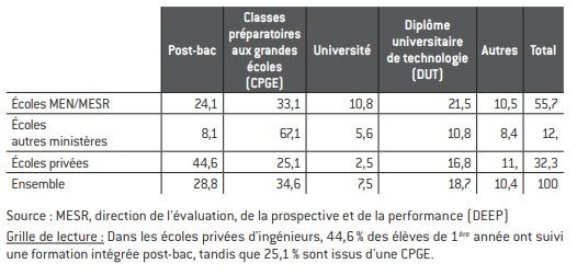 Grille de lecture : Dans les écoles privées d’ingénieurs, 44,6 % des élèves de 1ère année ont suivi une formation intégrée post-bac, tandis que 25,1 % sont issus d’une CPGE.