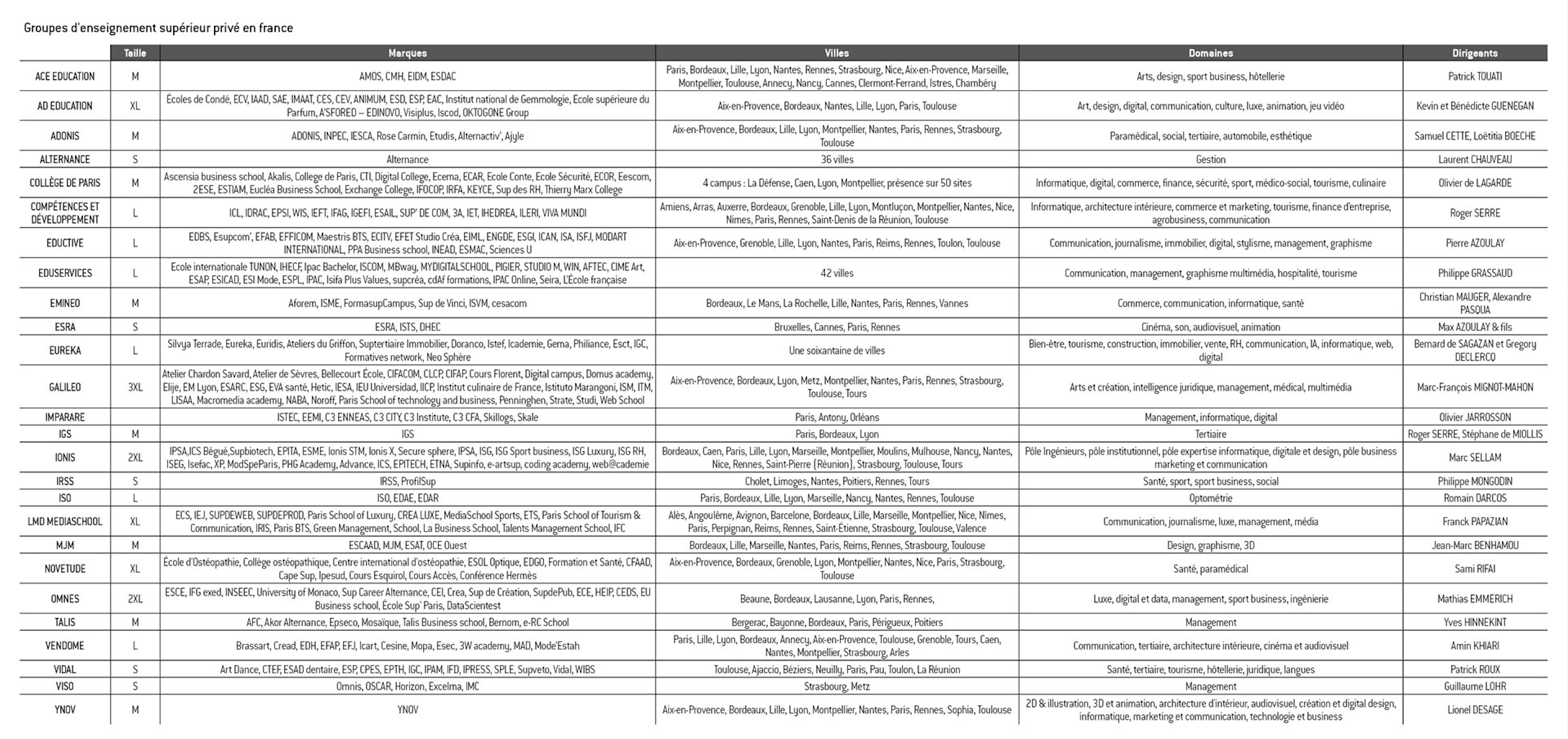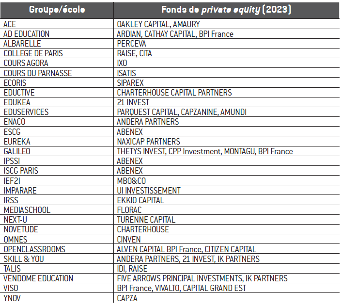 La plupart des fonds affichent leur portefeuille de participations dans les entreprises. Sous réserve d’inventaire, une trentaine d’établissements ont ainsi ouvert leur capital à des investisseurs. À l’inverse, de nombreux fonds, y compris parmi les plus grands, n’ont pas fait le choix d’investir dans l’enseignement privé, parce qu’ils privilégient d’autres secteurs d’activité, ou parce qu’ils n’ont pas identifié de cible attractive, ou encore parce que les prix de transaction leur paraissent trop élevés.