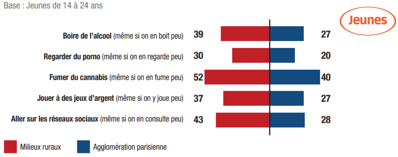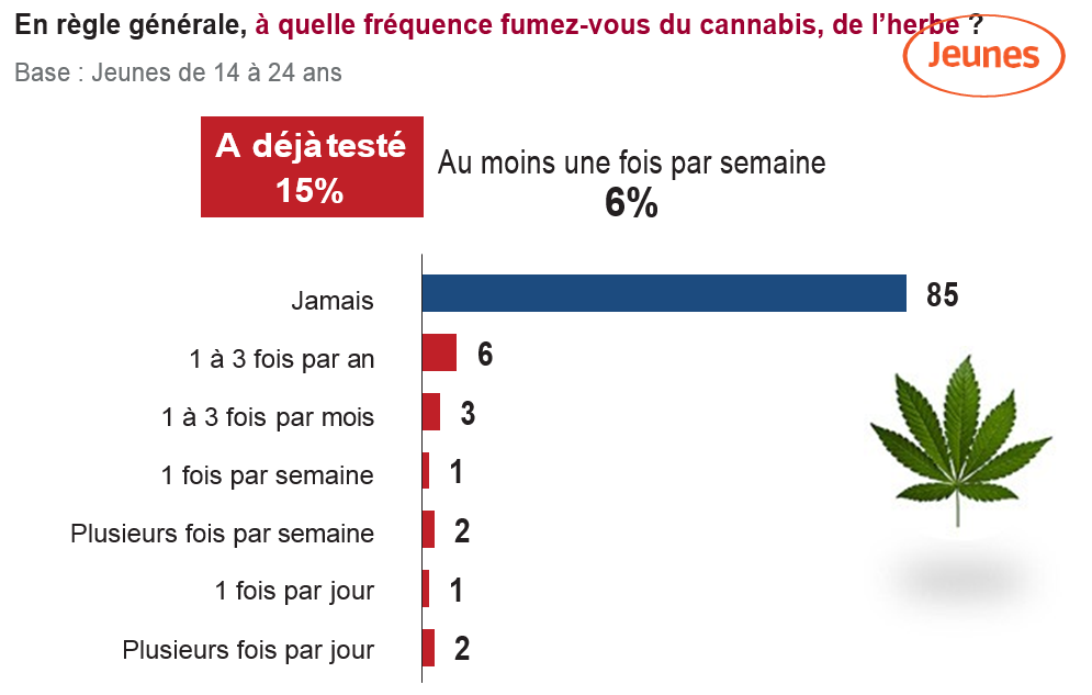 Cannabis : 9% des jeunes Français disent fumer du cannabis au moins une fois par mois, 5% chez les moins de 18 ans et 10% chez les 18-24 ans. Dans les communes de moins de 20.000 habitants, 8% des 14-24 ans déclarent avoir déjà fumé du cannabis. Ce chiffre grimpe à 25% en région parisienne.