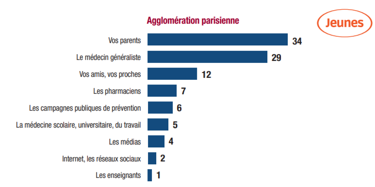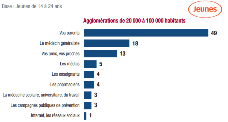 Les données sur les jeunes issus d’une petite ville (20.000 à 100.000 habitants) sont riches d’enseignements. Ceux-ci font en premier confiance à leurs parents pour les informer sur les dangers de la drogue, de l’alcool, du tabac…, mais cette confiance accordée aux parents se fait au détriment de la confiance accordée aux médecins généralistes.
