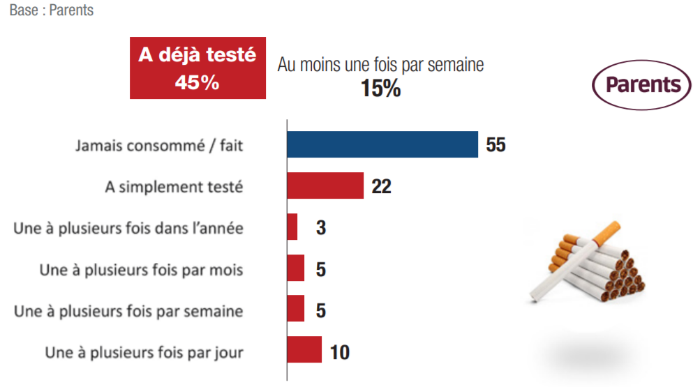Pour le tabac, presque un tiers des parents (32%) pensent qu’il est nocif d’en fumer dès la première fois, alors que 20% des jeunes le pensent. Pour l’alcool, 25% des parents considèrent qu’il est toujours dangereux de boire de l’alcool, contre 11% des jeunes. Les jeunes font sur ce sujet preuve d’inconscience puisqu’ils sont 54% à estimer que boire de l’alcool devient dangereux seulement à partir d’une fois par jour ou plus.