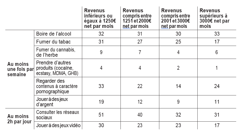 Pour cinq des huit addictions étudiées dans cette enquête, les jeunes dont les parents ont les revenus les plus modestes, inférieurs ou égaux à 1.250 euros, sont plus exposés que les jeunes appartenant à un foyer dont le revenu est supérieur à 3.000 euros net par mois.