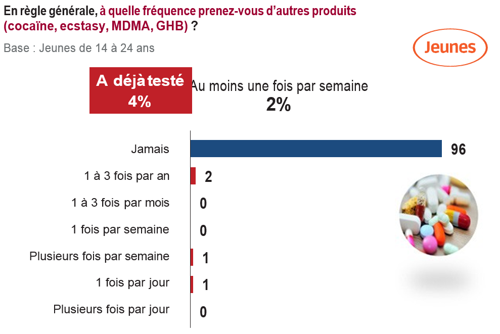 Si nous cherchons à extrapoler les résultats de notre enquête selon les données de l’INSEE, nous obtenons un chiffre supérieur à 350.000 jeunes de 14-24 ans qui auraient déjà consommé de la cocaïne, de l’ecstasy, de la MDMA ou du GHB en France. Parmi ces personnes, la moitié en consommerait au moins une fois par semaine, soit environ 175.000 jeunes.