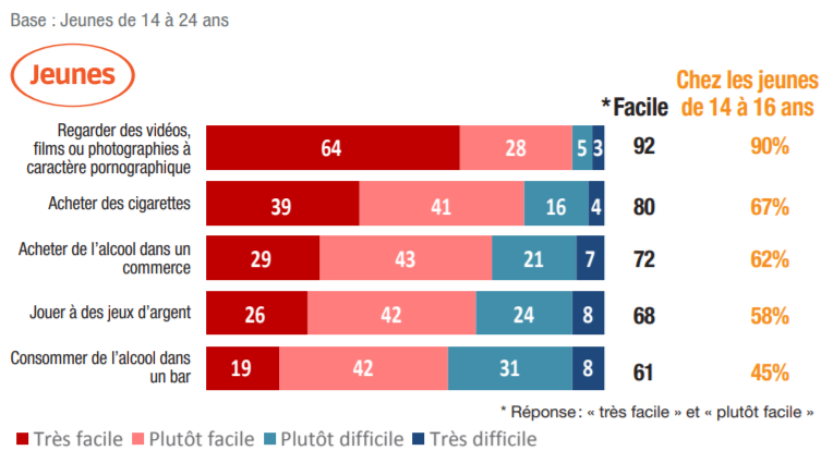 La facilité avec laquelle les mineurs peuvent visionner des images pornographiques pourrait être liée à la multiplication et à la propagation des supports donnant accès à ces contenus : ordinateurs, tablettes et smartphones, mais aussi via les réseaux sociaux et les jeux vidéo. Notre enquête le confirme : 92% des jeunes de 14 à 24 ans estiment qu’il est simple pour les mineurs d’accéder à des images à contenu pornographique. Enfin, 68% des 14-24 ans estiment qu’il est facile pour les mineurs d’accéder aux jeux d’argent.