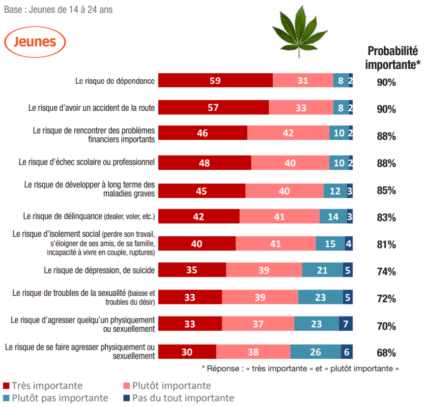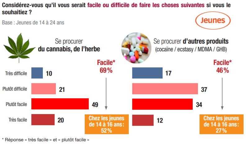 – 69% des jeunes de 14-24 ans estiment qu’il est facile de se procurer du cannabis ; plus grave encore, chez les mineurs, ce pourcentage est de 64% ;