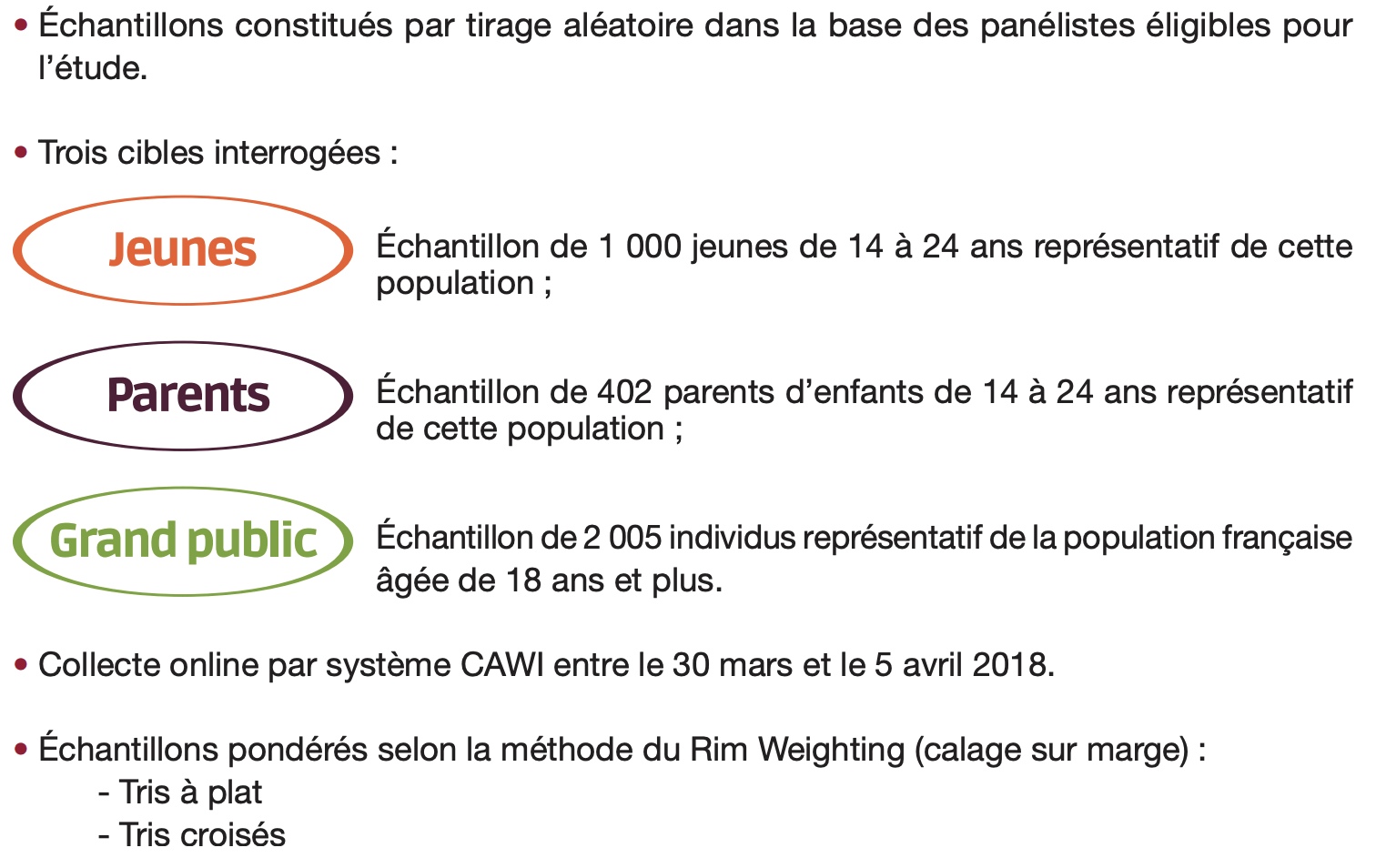 Nous avons également souhaité soumettre notre questionnaire à un échantillon de parents de jeunes de 14-24 ans (402 parents), ainsi qu’au grand public (2.005 personnes) pour mesurer les écarts de perception entre leur propre réalité et celle des jeunes générations.