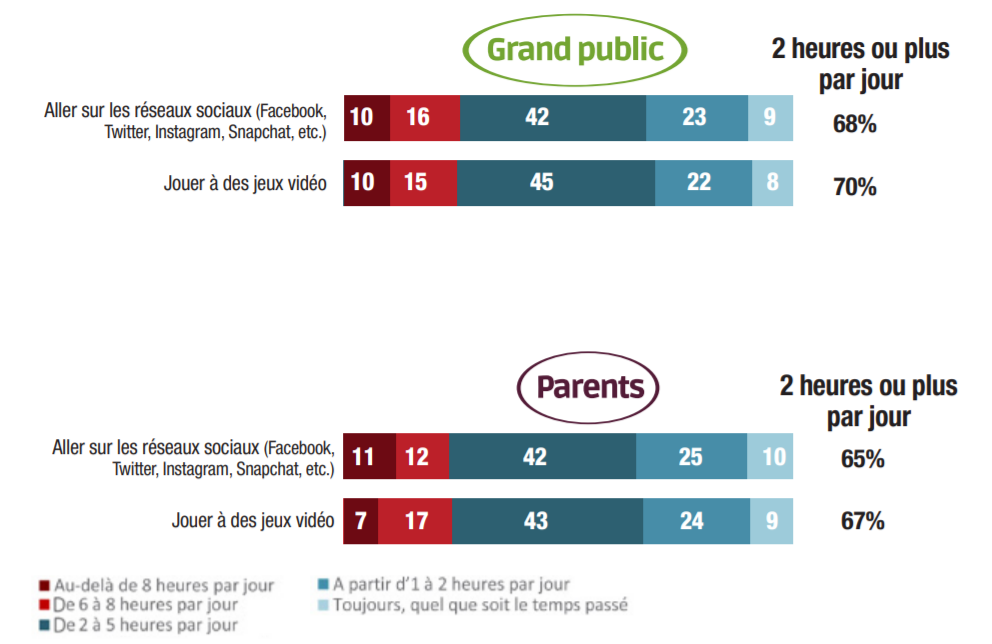 Face aux dangers des écrans, les parents sont même moins sensibles que les jeunes. Presque deux tiers d’entre eux (65%) considèrent que les réseaux sociaux ne présentent un risque qu’à partir de 2 heures par jour ; les jeunes (82%) sont plus inquiets que leurs parents. Lorsqu’il s’agit des jeux vidéo, on trouve la même configuration : une proportion équivalente (67%) des parents ne voit un risque qu’à partir de 2 heures quotidiennes, tandis que, là encore, l’inquiétude est beaucoup plus répandue chez leurs enfants (83%).