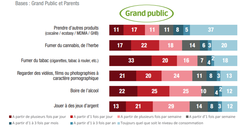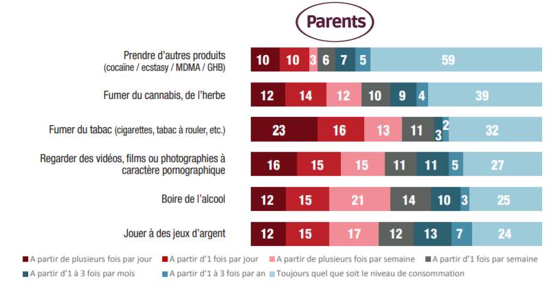 À travers ces différents résultats, on constate que si les parents ont pour la plupart conscience que leurs enfants ont déjà testé ces produits, en revanche ils sous-évaluent grandement la fréquence de leurs consommations ou de leurs pratiques. Les parents ont donc une mauvaise perception de l’exposition de leurs enfants aux risques d’addiction en sous- estimant nettement la consommation et les comportements addictifs des jeunes. Ainsi, 28% des parents nous disent qu’ils seraient « surpris » d’apprendre que leur enfant visionne souvent du porno, ce qui est pourtant le cas. On imagine sans peine le défaut de vigilance que peut entraîner une telle perception et les conséquences qui en découlent. Pour l’heure, il n’y a pas d’actions significatives des pouvoirs publics destinées à sensibiliser les parents aux dangers de l’addiction, à l’identification des formes diverses qu’elle peut prendre et à la manière de les prévenir comme de les combattre