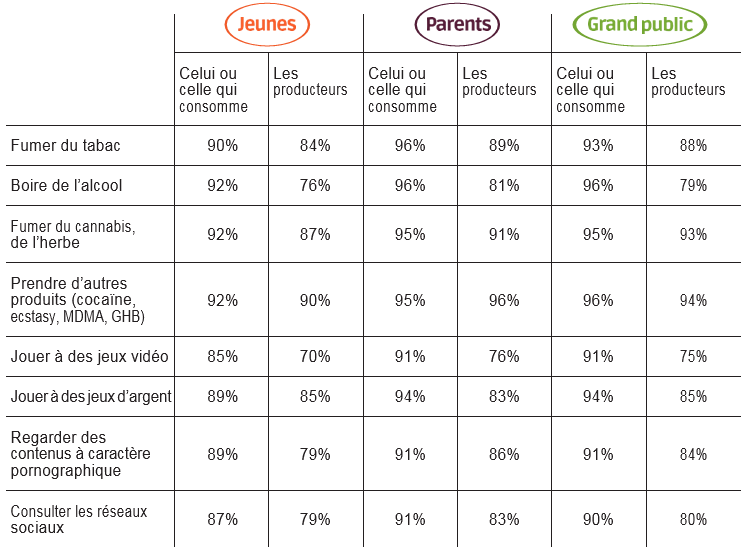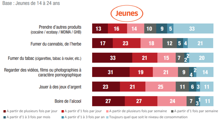 Nous montrons que tous ces éléments, aussi préoccupants qu’ils soient, sont étonnamment sous-estimés par les parents. C’est pourquoi nous espérons que notre travail suscitera une prise de conscience des carences majeures qui existent aujourd’hui dans la protection des mineurs, tant dans l’accès aux produits dangereux que dans l’accès aux contenus dangereux. Notre enquête informe sur la bonne connaissance, en général, de la dangerosité des différents produits et comportements. Pour ce qui concerne les consommations à risque, ceci est vraisemblablement l’heureuse conséquence d’une compréhension satisfaisante des campagnes publiques d’information. En revanche, il n’existe aucune campagne sensibilisant les jeunes, leurs parents et le public en général aux dangers de l’addiction aux écrans en général, et en particulier aux contenus à caractère pornographique. Quant aux surconsommations à haute dose de jeux vidéo et de réseaux sociaux, non seulement elles ne font l’objet de quasiment aucune mise en garde, mais elles bénéficient même d’une forme d’assentiment public implicite, voire d’une promotion généralisée.