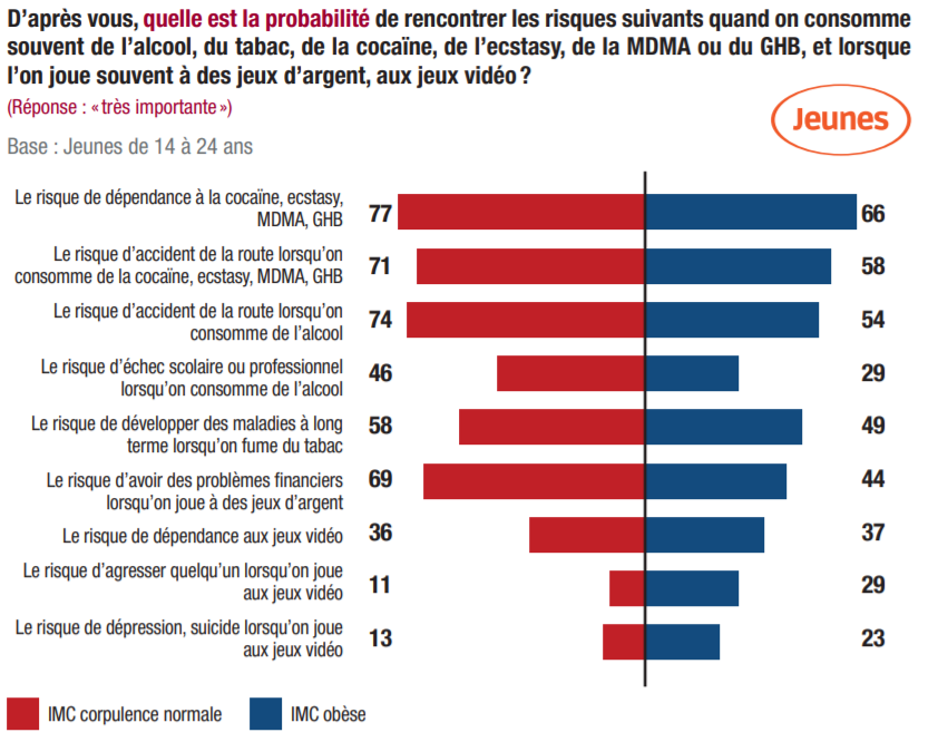 Grâce aux questions permettant d’estimer l’indice de masse corporelle* (IMC) des répondants, on voit que les jeunes obèses perçoivent généralement moins bien que les autres les risques liés aux addictions – sauf pour les cas d’agressions envers une personne, de dépression, suicide, traduisant une certaine fragilité psychologique.