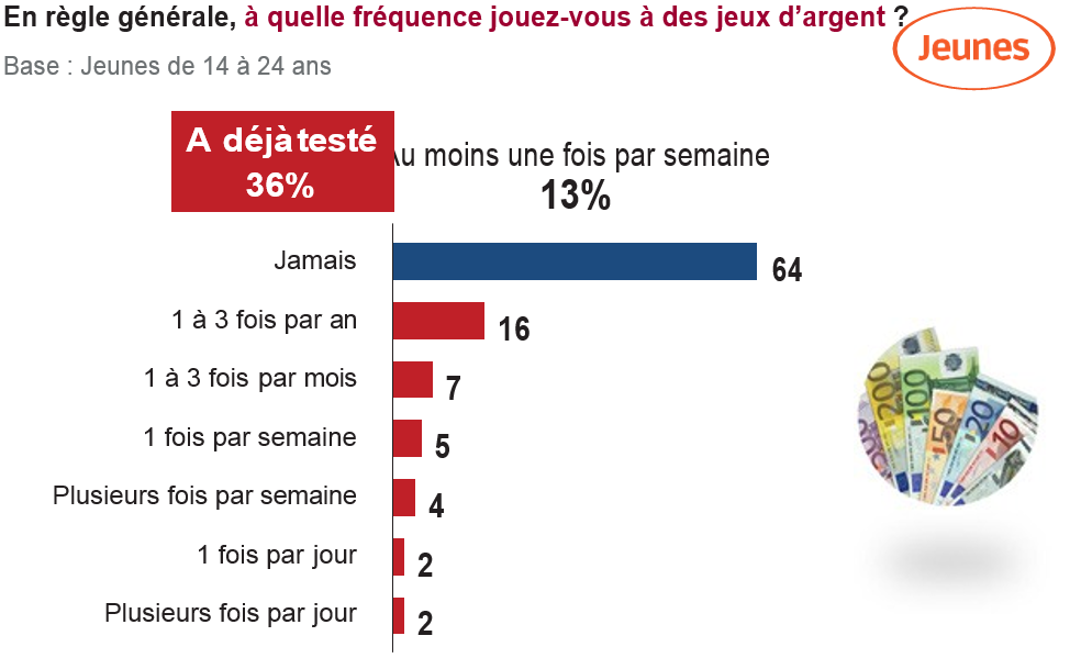 Plus d’un tiers (36%) des jeunes déclarent avoir déjà essayé les jeux d’argent et 13% y jouent au moins une fois par semaine dont 17% des garçons et 9% des filles. 10% des 14-17 ans y jouent au moins une fois par mois. Plus le milieu est modeste, plus les jeunes ont tendance à jouer : 40% des jeunes relevant d’un foyer dont le revenu mensuel net est inférieur ou égal à 1.250 euros ont déjà testé, contre 32% pour ceux appartenant à un foyer dont le revenu est supérieur à 3.000 euros.