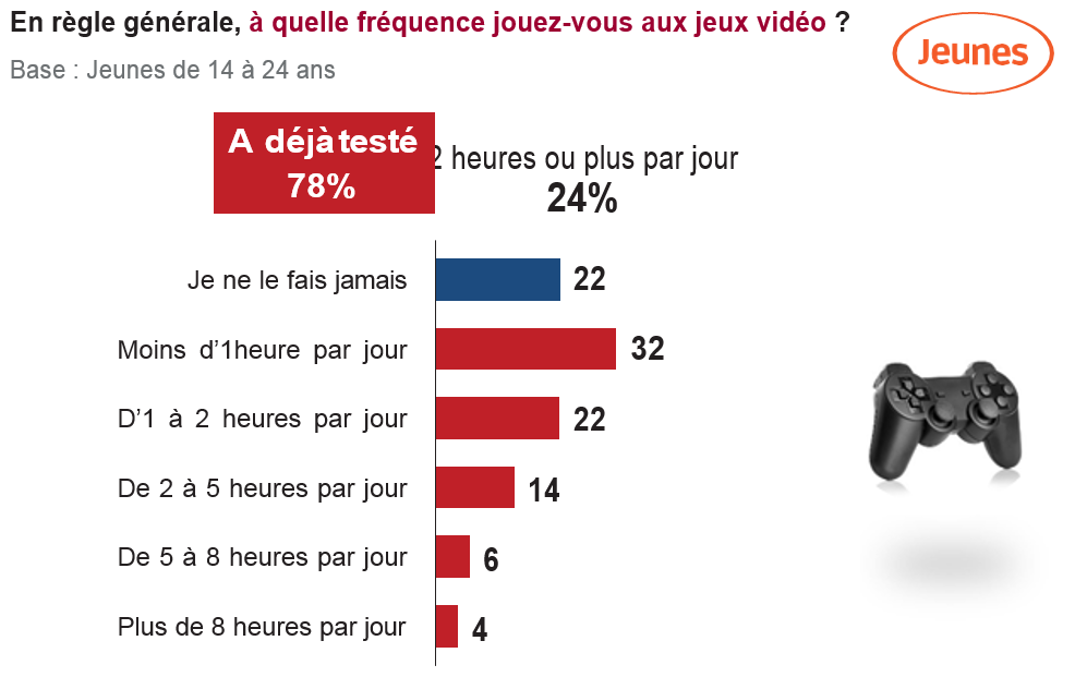 16% des 18-22 ans disent passer plus de 5 heures par jour sur les jeux vidéo et 7% plus de 8 heures. Les jeux vidéo constituent un véritable phénomène de société : 46% des 14-24 ans consacrent quotidiennement au moins 1 heure aux jeux vidéo, et plus précisément 60% des garçons.