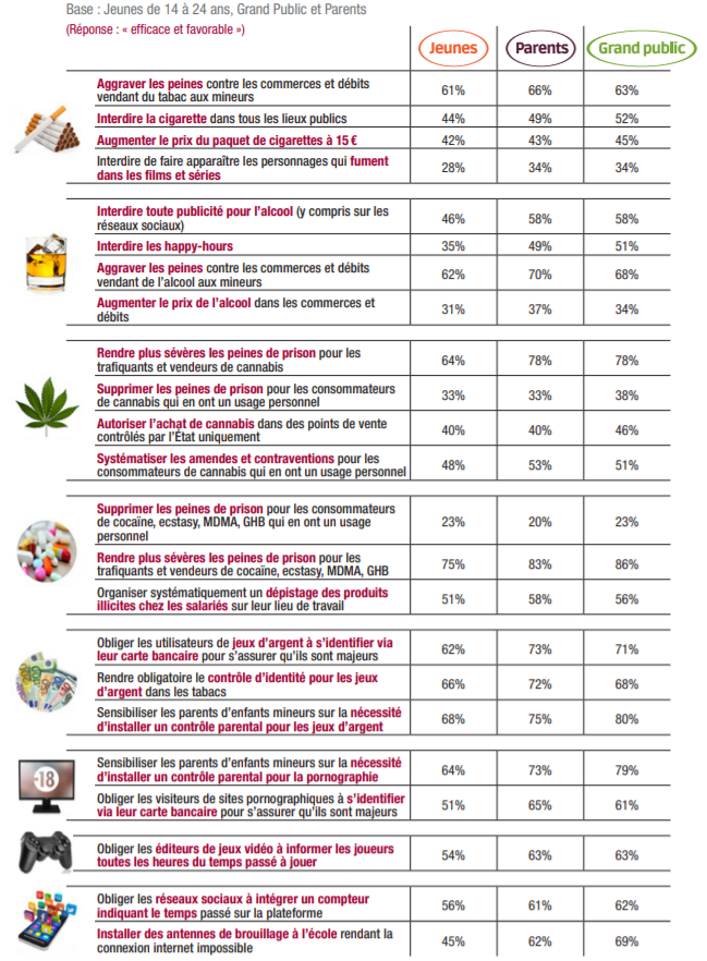 Dans cette enquête, nous avons testé l’acceptabilité de mesures destinées à lutter contre les addictions. Certaines divergences apparaissent entre les différentes cibles interrogées : les jeunes, les parents et le grand public.