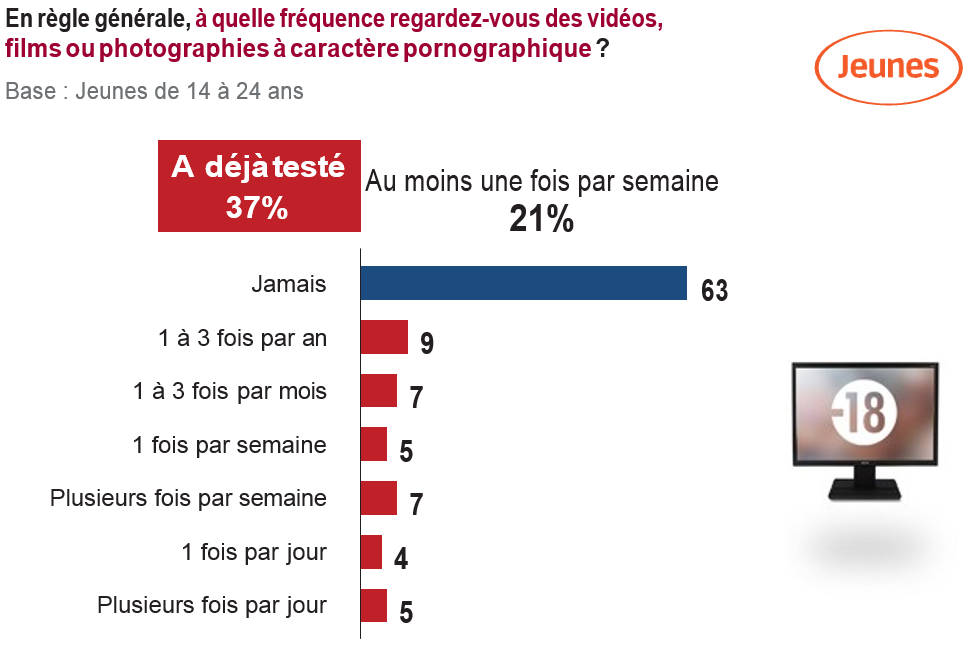 Un cinquième des 14-24 ans (21%) regardent au moins une fois par semaine du porno. Plus d’un tiers (37%) déclarent avoir déjà visionné ce type de programme, avec une forte différence entre les garçons (46%) et les filles (28%). Cet écart se creuse avec l’âge : ainsi, chez les 14-17 ans, 18% des garçons regardent au moins une fois par semaine du porno, contre 12% des filles ; à partir de 18 ans, la consommation hebdomadaire concerne 33% des hommes, contre 16% des femmes.