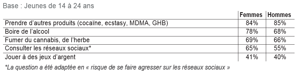 Il en va de même pour les jeux d’argent (24% des parents considèrent qu’il est toujours nocif de jouer à des jeux d’argent, contre 11% des jeunes) et des contenus à caractère pornographique (les parents sont 27% à penser que cela est dangereux quel que soit le niveau de consommation, alors que les jeunes sont seulement 14%).