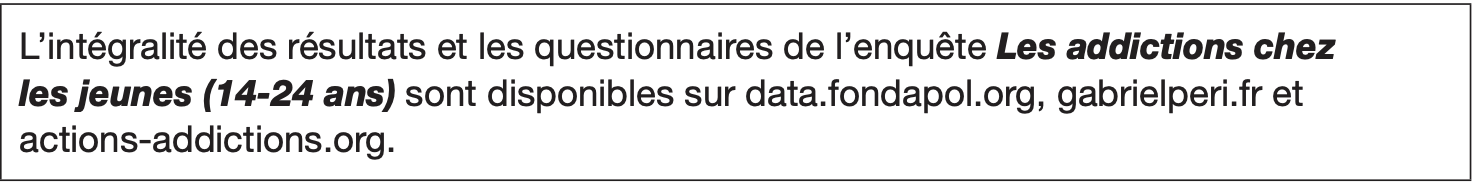 L’enquête Les addictions chez les jeunes (14-24 ans) a été conçue par la Fondation pour l’innovation politique, la Fondation Gabriel Péri et le Fonds Actions Addictions. Sa réalisation a été confiée à l’institut d’études Ipsos.