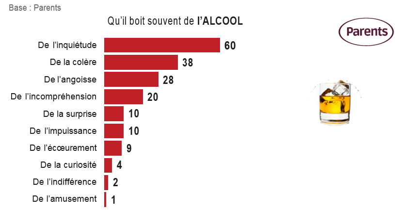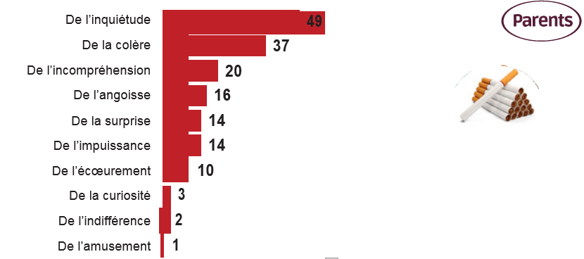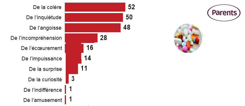 L’inquiétude est la première réaction des parents apprenant que leurs enfants consomment de l’alcool, du tabac, du cannabis, visionnent du porno, jouent aux jeux vidéo ou à des jeux d’argent. La consommation de cocaïne, d’ecstasy, de MDMA et de GHB suscite également de la colère des parents, mais le risque d’une addiction aux écrans est manifestement encore mal perçu. Enfin, l’utilisation des réseaux sociaux est majoritairement sous-évaluée par les parents : le réveil risque alors d’être douloureux…