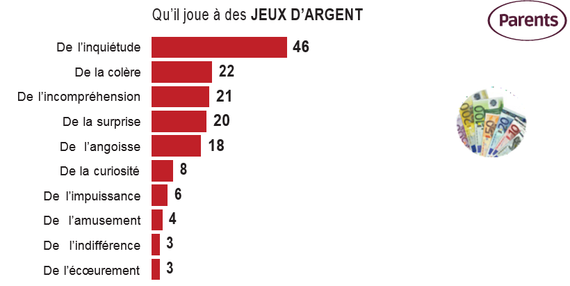 Il en va de même pour les jeux d’argent : 45% des parents estiment que leurs enfants ont déjà joué de l’argent, soit sensiblement plus que ce que déclarent les jeunes (36%), mais seulement 5% des parents pensent que leurs enfants jouent au moins une fois par semaine, ce que nous disent faire 13% des jeunes que nous avons interrogés.