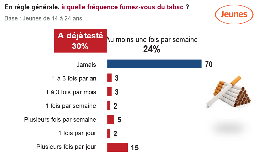 Tabac : 15% des jeunes fument du tabac plusieurs fois par jour. Là aussi, on observe une augmentation de la consommation avec l’âge : 5% chez les 14-17 ans, 15% chez les 18-22 ans et plus d’un quart (27%) chez les 23-24 ans. Le milieu social de l’enfant joue également un rôle : plus le revenu mensuel net du foyer est bas, plus le pourcentage de jeunes qui fument plusieurs fois par jour est élevé (21% en dessous de 1.250 euros, 17% entre 1.251 et 2.000 euros, 13% entre 2.001 et 3.000 euros, 12% au-dessus de 3.000 euros).