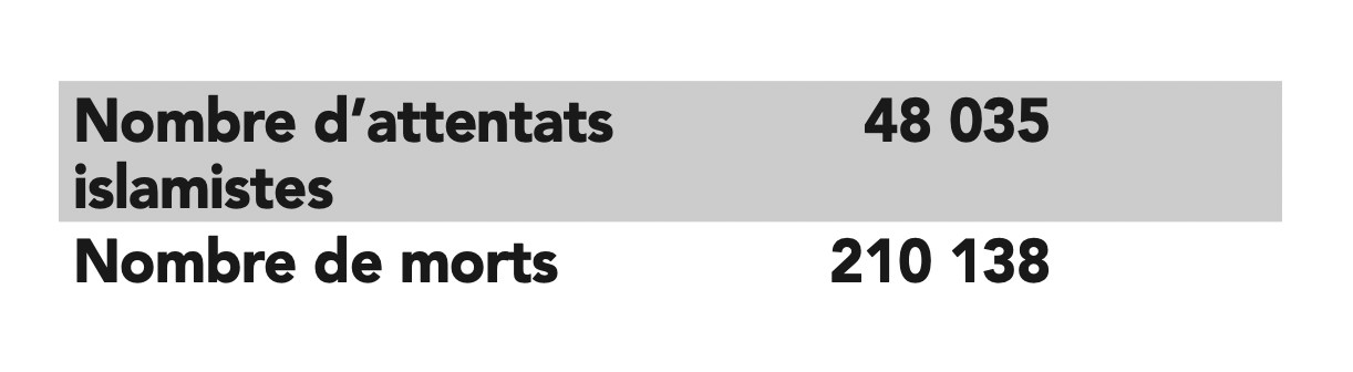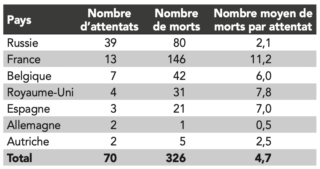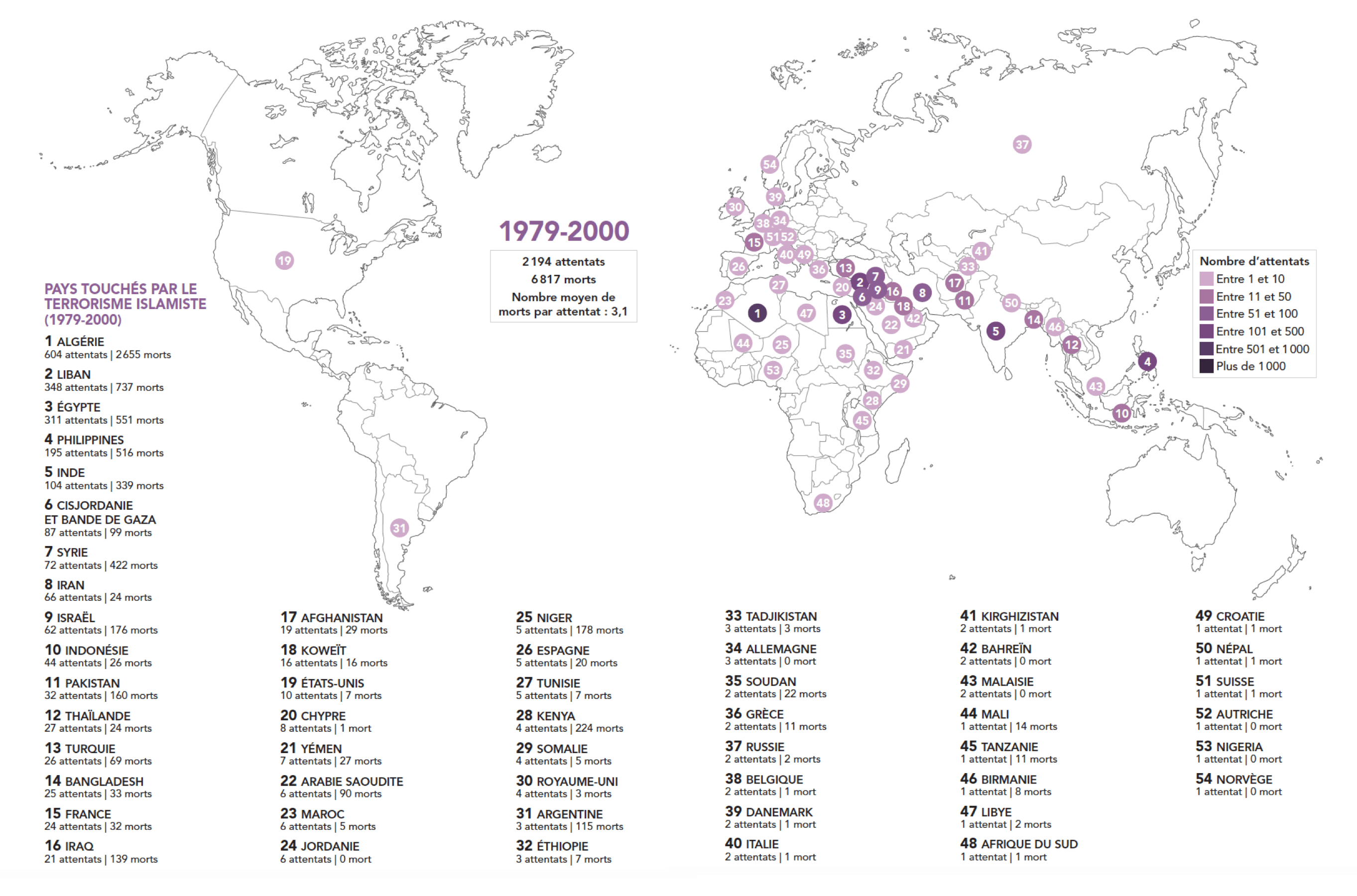 La série d’attaques du 11 septembre 2001 est la plus meurtrière de l’histoire du terrorisme, avec 3001 morts et 16.493 blessés1. En Europe (hors Russie), depuis 1979, on recense 197 attentats et 789 morts. En France, pays d’Europe le plus touché sur cette même période, on compte 82 actes terroristes islamistes ayant entraîné la mort de 330 personnes. Outre la France, l’Allemagne, l’Autriche, la Belgique, la Bosnie-Herzégovine, la Bulgarie, Chypre, la Croatie, le Danemark, l’Espagne, la Finlande, la Grèce, l’Italie, la Norvège, les Pays-Bas, le Royaume-Uni, la Suède et la Suisse ont été frappés, parfois à plusieurs reprises. C’est néanmoins en dehors du monde occidental que les pays ont subi la violence islamiste plus souvent et plus durement encore.